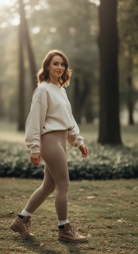 Beige leggings with a cream oversized sweatshirt and light brown hiking boots create a soft, calming outfit. It feels warm, inviting, and perfect for relaxed outdoor walks or weekend downtime.