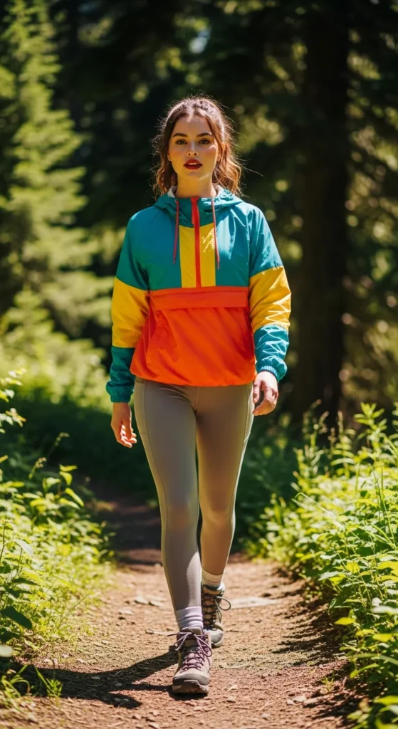 Neutral leggings paired with a bright colored windbreaker and hiking boots add energy and personality to your look without feeling overwhelming or overly bold.