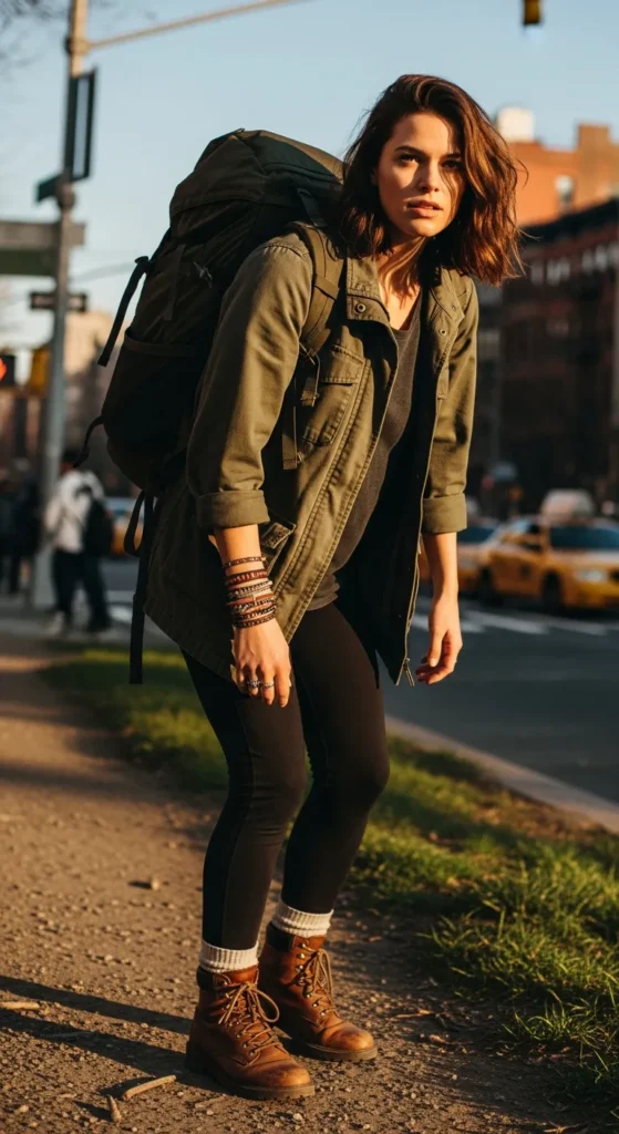 Black leggings with a utility jacket and hiking boots create a versatile look that works for both outdoor trails and casual city moments without needing a full outfit change.