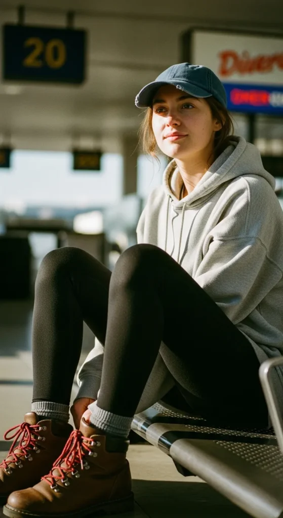 Soft stretch leggings with a relaxed hoodie and hiking boots create a comfortable travel-ready outfit that still looks styled and intentional for long days on the move.