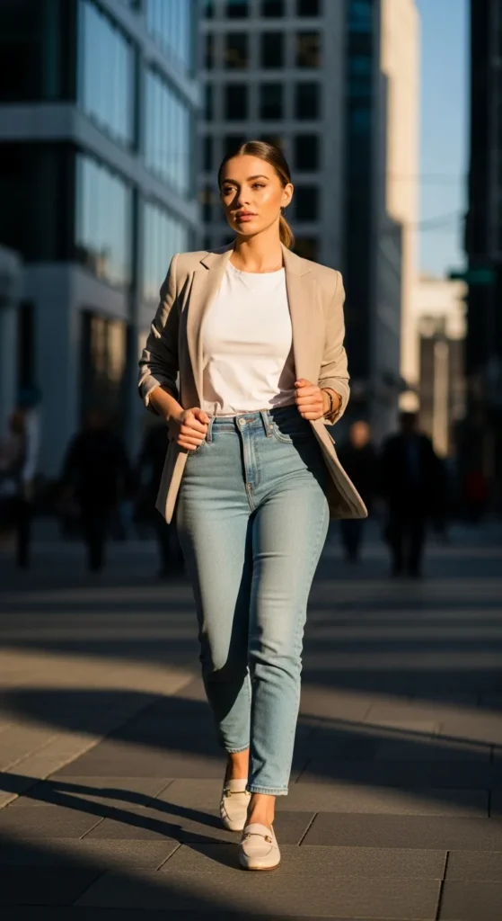 A structured blazer over light blue jeans creates a perfect mix of polished and relaxed. It’s ideal for days when you want to feel put together without being overdressed.