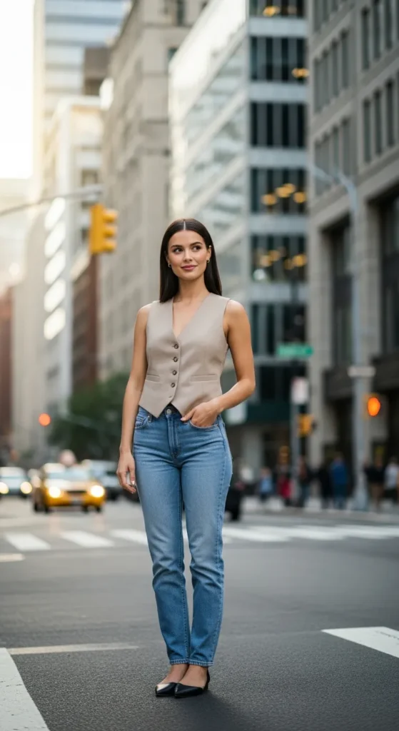 A fitted vest worn as a top with light blue jeans gives a slightly tailored, fashion-forward look while still being wearable for everyday outings.