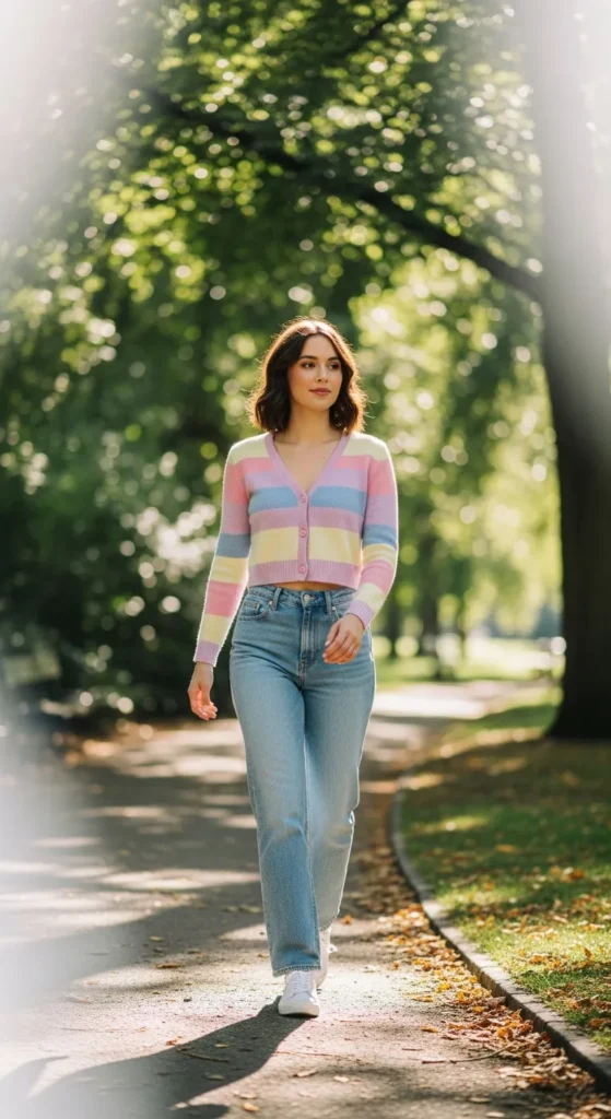 A fitted cropped cardigan with light blue jeans creates a sweet, balanced silhouette. It defines the waist while keeping the look soft and approachable, perfect for transitional weather or casual meetups.