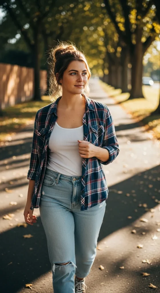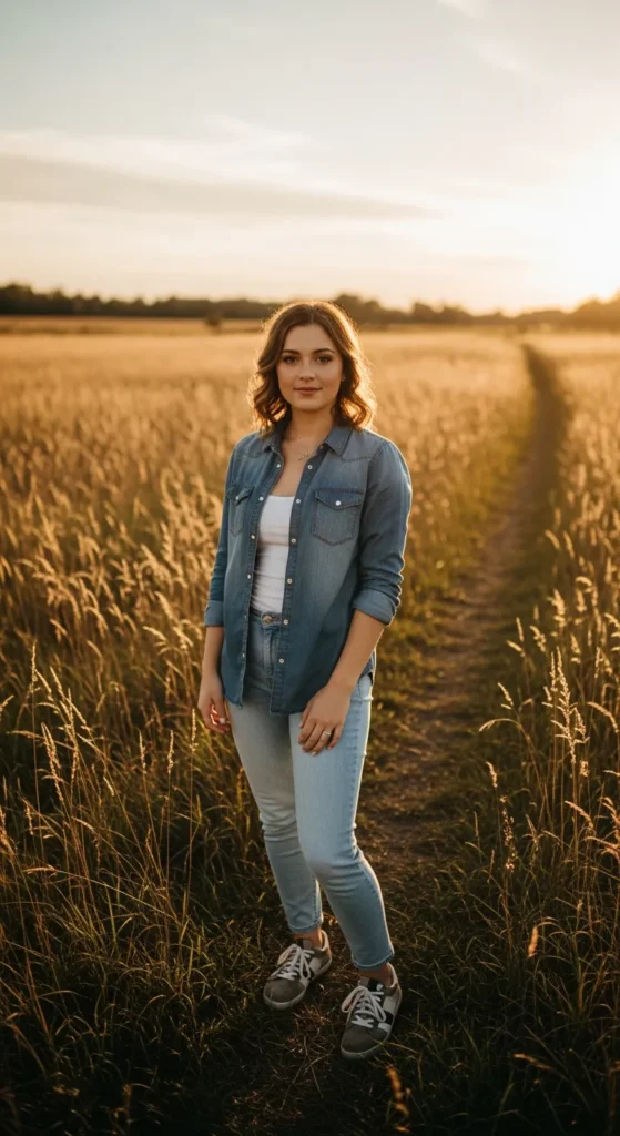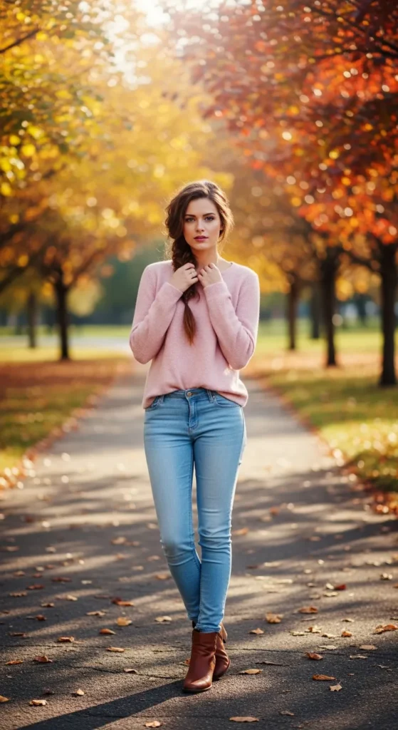 A lightweight sweater tucked into light blue jeans is perfect for in-between weather. It feels cozy without being heavy, offering comfort and style in equal measure.