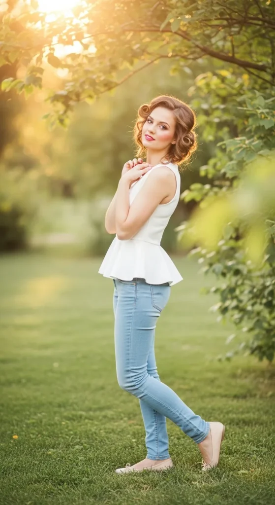 A flowy peplum top paired with light blue jeans creates a soft, romantic silhouette. It adds movement and shape, making the outfit feel playful yet refined.
