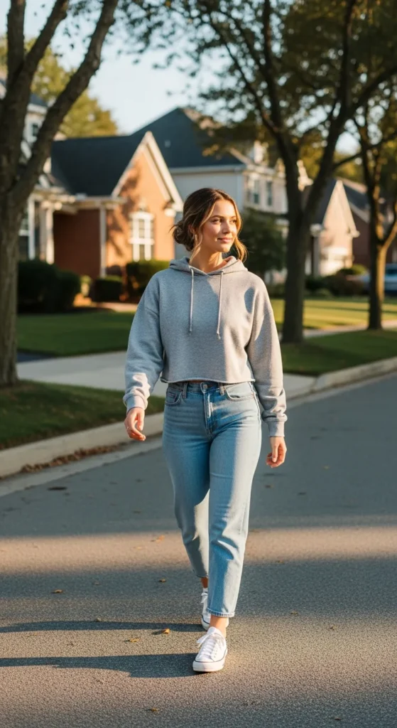 A lightweight hoodie paired with light blue jeans feels like a cozy weekend wrapped in style. It’s relaxed, approachable, and perfect for running errands or slow mornings.