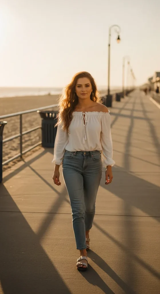 An off-shoulder top with light blue jeans feels soft, breezy, and subtly flirty. It’s perfect for casual days when you want a hint of elegance.