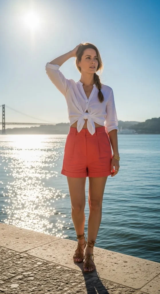 High-waisted coral shorts paired with a breezy white blouse scream Lisbon summer style. Ideal for walking through markets or riverfronts.