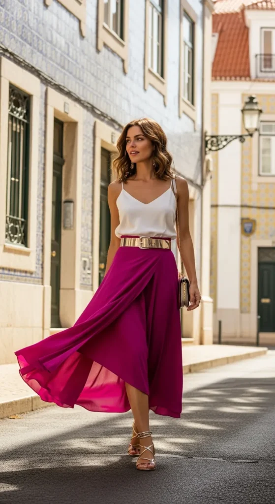 A bright fuchsia wrap skirt with a simple white camisole creates a vibrant contrast, perfect for daytime exploring or photo ops.