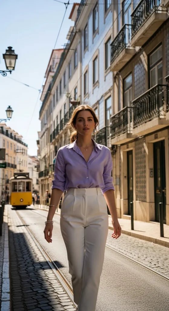 A soft lavender shirt tucked into crisp white pants gives a fresh, elegant daytime look for exploring Lisbon’s historic quarters.