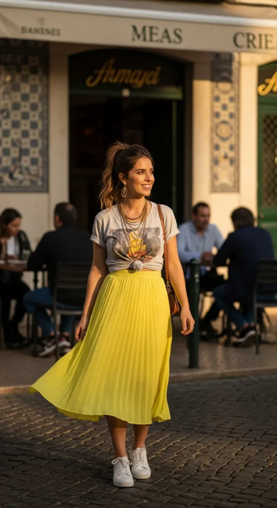 Pair a lemon yellow pleated midi skirt with a fun graphic tee tucked in. Comfortable yet playful, perfect for cafes and street art spots.