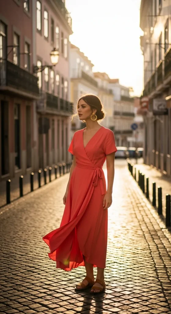 A flowing coral wrap dress paired with tan sandals creates an effortless summer vibe. The dress catches the light beautifully, highlighting your movement on Lisbon’s scenic streets.