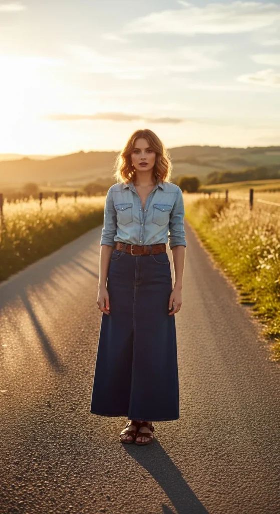 Layering a chambray shirt with a long denim skirt creates a double-denim look that feels fresh and stylish rather than heavy.