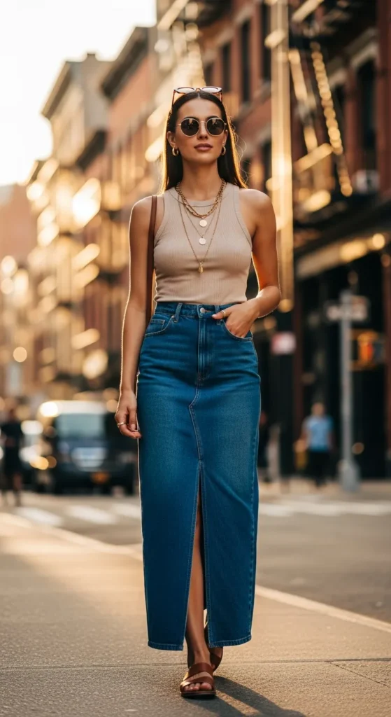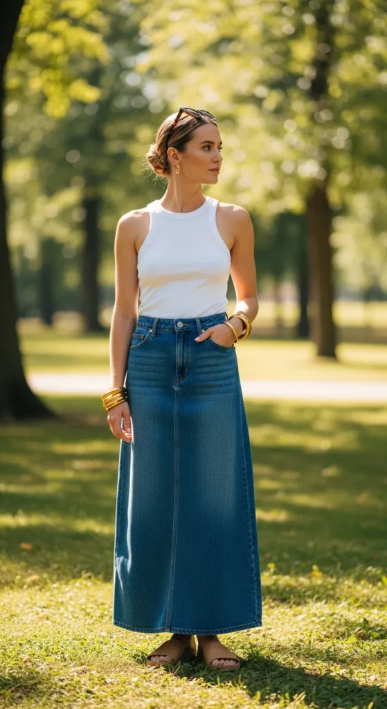 A fitted ribbed tank with a high-waist long denim skirt creates a flattering silhouette that feels simple yet stylish. The fitted top balances the skirt’s structure while keeping the outfit cool for sunny summer days.