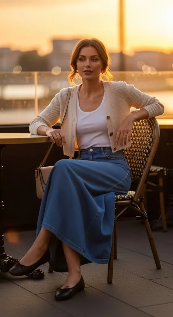 A lightweight cropped cardigan layered over a simple tank with a long denim skirt creates a cozy yet breathable summer outfit. It’s ideal for slightly breezy evenings or shaded outdoor gatherings.