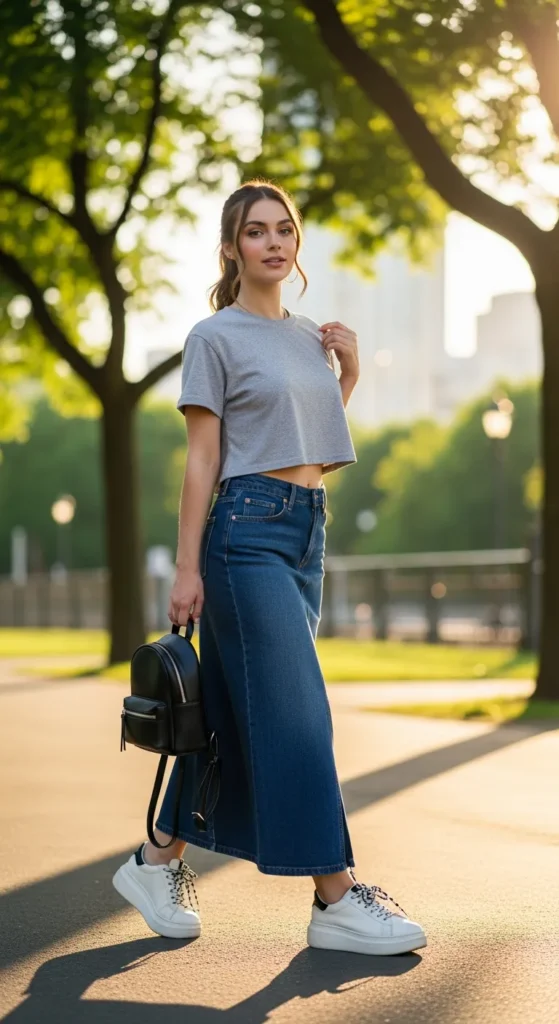 A simple cropped tee styled with a long denim skirt creates a youthful and comfortable summer outfit perfect for everyday errands or casual hangouts.