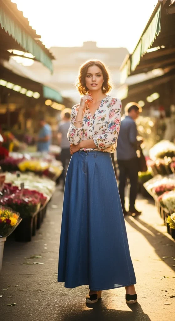 A soft floral blouse paired with a long denim skirt creates a charming summer look that feels romantic and relaxed at the same time.