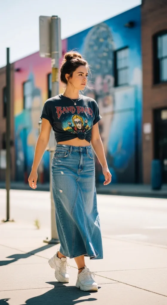 A relaxed graphic tee styled with a vintage-inspired long denim skirt gives the outfit a cool, effortless personality. It feels casual, youthful, and perfect for music festivals, weekend markets, or coffee runs.