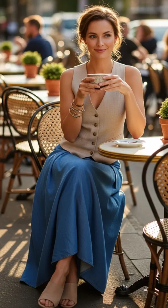 A sleeveless linen vest top paired with a long denim skirt creates a polished yet breathable outfit that feels perfect for warm summer afternoons.