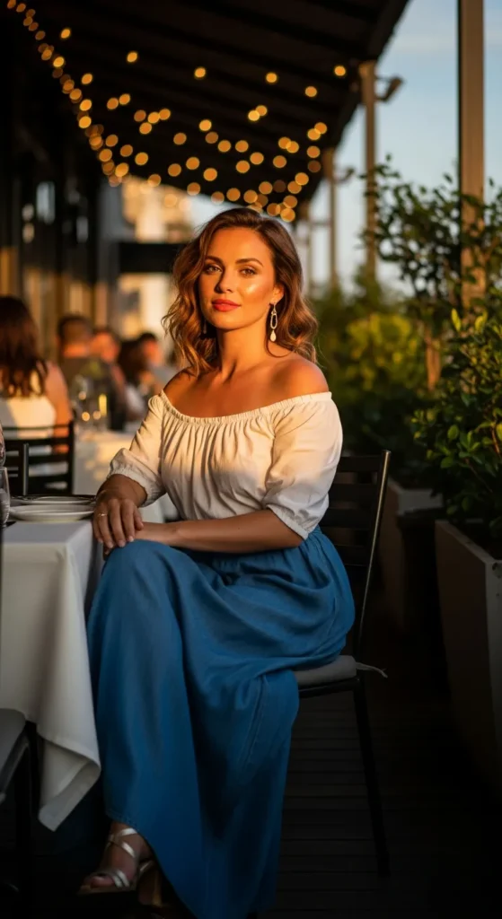 An off-shoulder summer top paired with a long denim skirt creates a breezy, feminine outfit perfect for warm evenings and casual summer dinners.