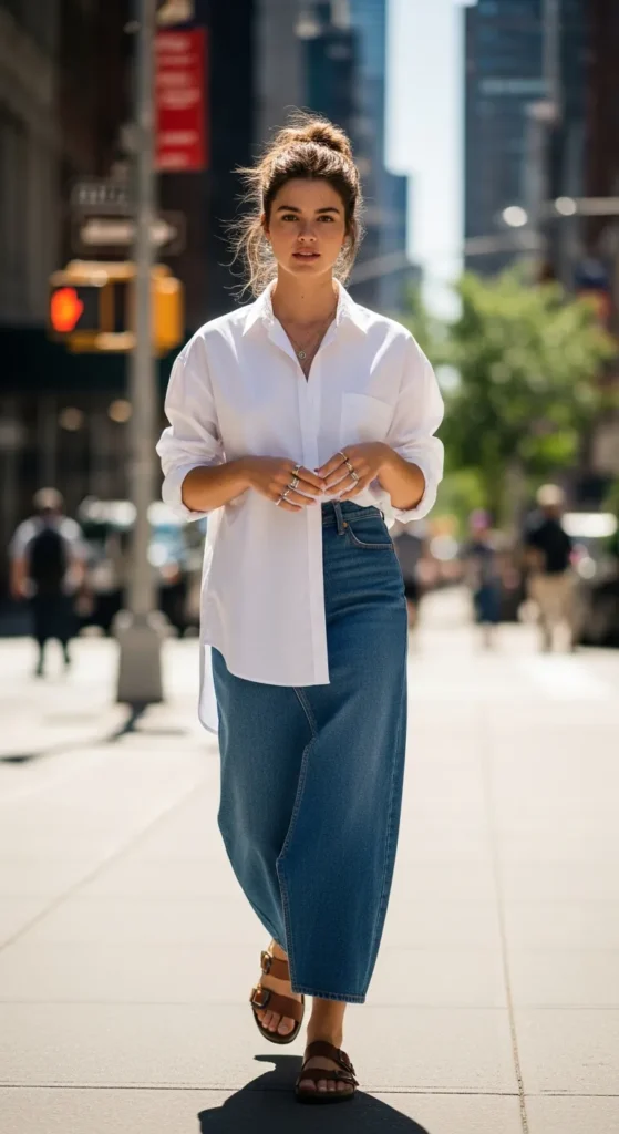 A crisp white linen shirt tucked into a classic long denim skirt creates a clean, airy summer outfit that feels both relaxed and polished. The breathable fabrics make it perfect for warm afternoons and casual city strolls.