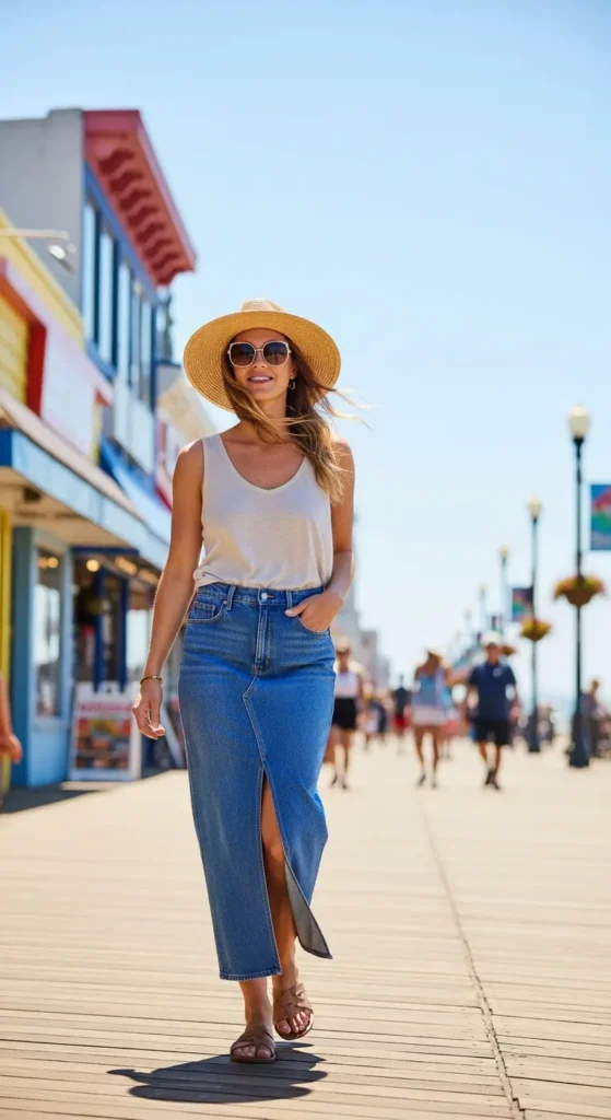 A relaxed cotton tank styled with a long denim skirt featuring a front slit creates an easy summer outfit that feels airy and practical for everyday wear.