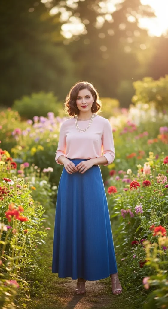 A light pastel blouse tucked into a long denim skirt creates a gentle, feminine summer outfit that feels soft and refreshing. The subtle color contrast adds charm without overpowering the look.