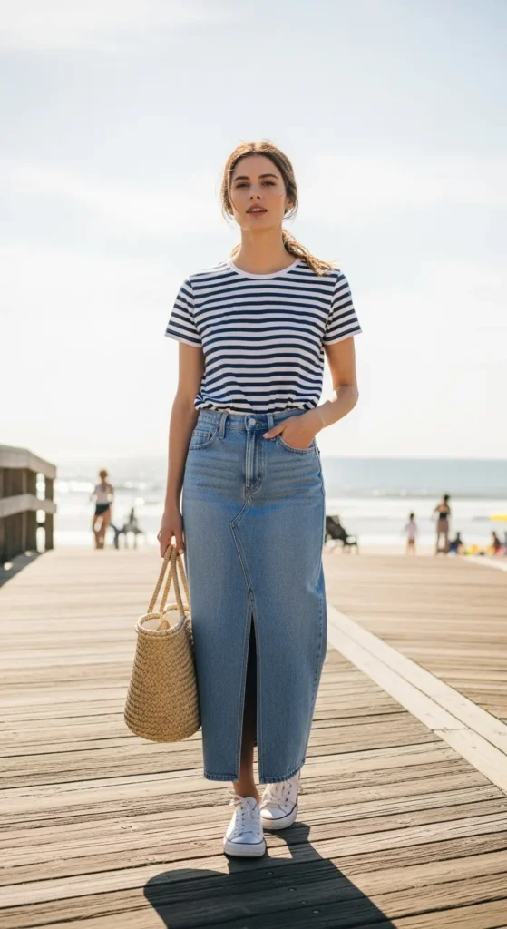 A soft striped tee paired with a light wash long denim skirt creates a playful yet relaxed summer outfit. The stripes add a classic coastal touch, making the whole look feel fresh and easy.