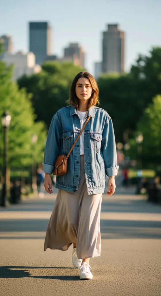 A casual denim jacket layered over a soft long skirt adds structure and ease. It’s a dependable outfit that feels familiar yet stylish.