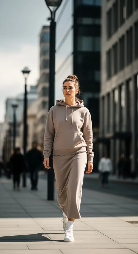 A casual hoodie styled with a straight long skirt feels modern and relaxed. It’s a cool balance of comfort and style that feels very good now.