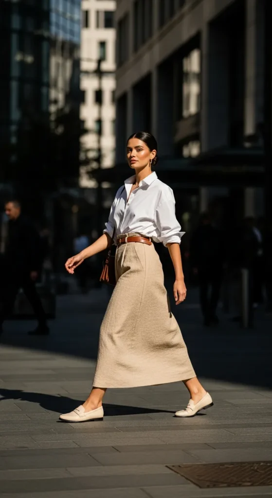 A classic white button-down meets a subtly textured long skirt for a clean, confident outfit. It feels effortless but intentional, perfect for days when you want to look put together without trying too hard.
