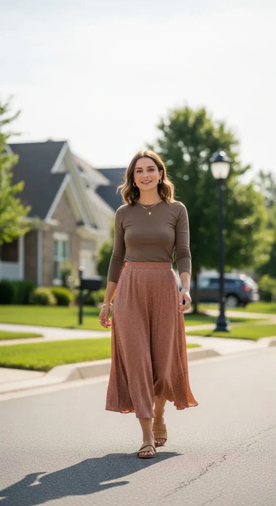 A fitted long-sleeve tee paired with a flowy skirt feels simple and flattering. It’s an easy way to go about everyday life.