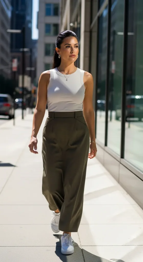 A simple fitted tank balances perfectly with a high-waist long skirt. The contrast between clean lines and flowing fabric creates an easy, confident silhouette that feels modern and wearable.