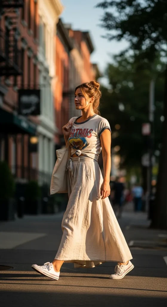 A graphic tee tucked into a neutral long skirt blends personality with polish. It’s playful but grounded, making it ideal for creative weekends or casual city strolls.