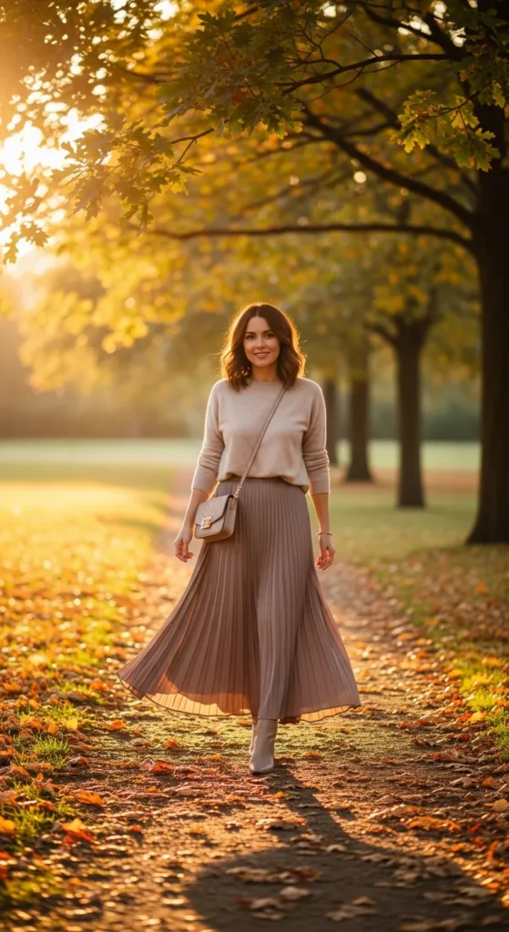 A lightweight sweater paired with a pleated long skirt creates beautiful movement and comfort. This outfit feels cozy yet elevated, ideal for transitional weather and relaxed social plans.