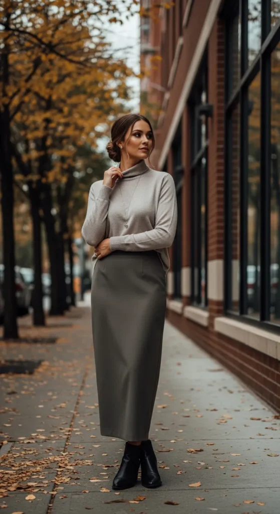 A lightweight turtleneck paired with a straight long skirt feels refined but approachable. It’s ideal for cooler days when you want warmth without bulk.