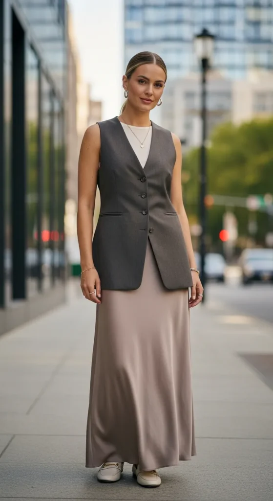 A neutral vest layered over a simple top with a soft long skirt feels modern and thoughtful. It adds interest without complexity.