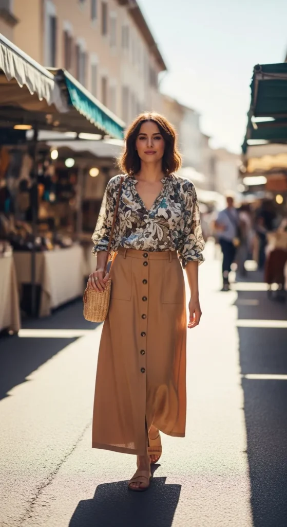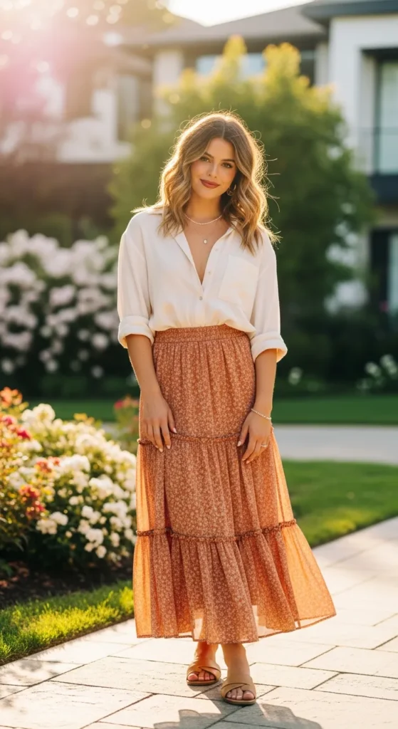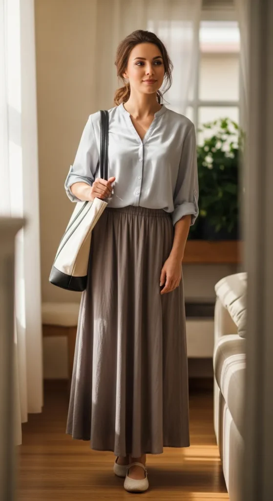 A relaxed blouse paired with a button-front long skirt feels breezy and approachable. It’s perfect for days when comfort matters but style still feels important.