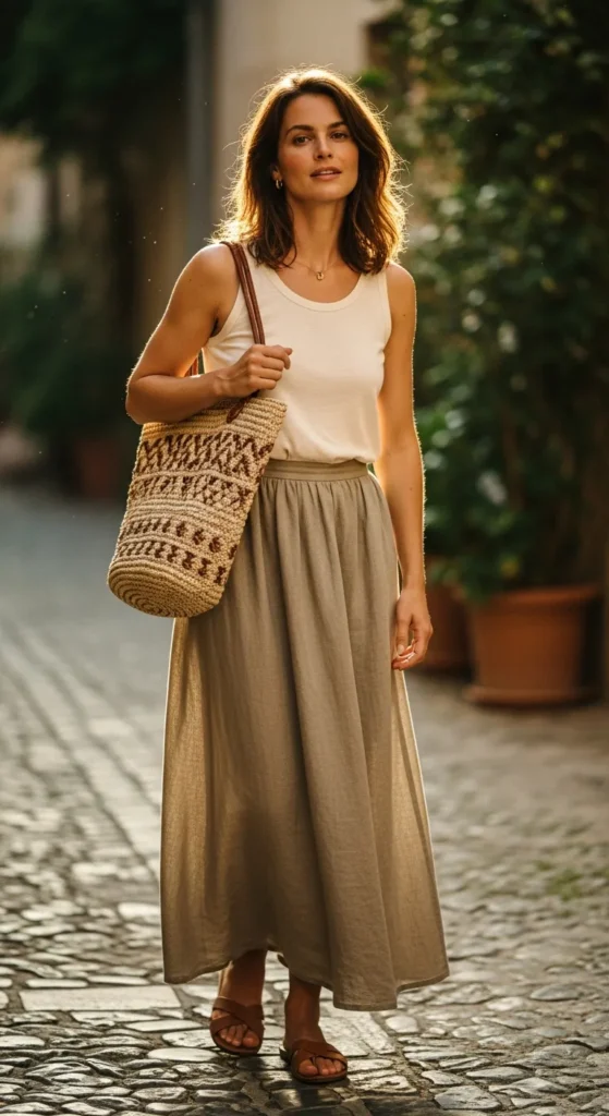 A relaxed tank paired with a linen long skirt feels breathable and easy. It’s perfect for warm days when comfort and style need to coexist.