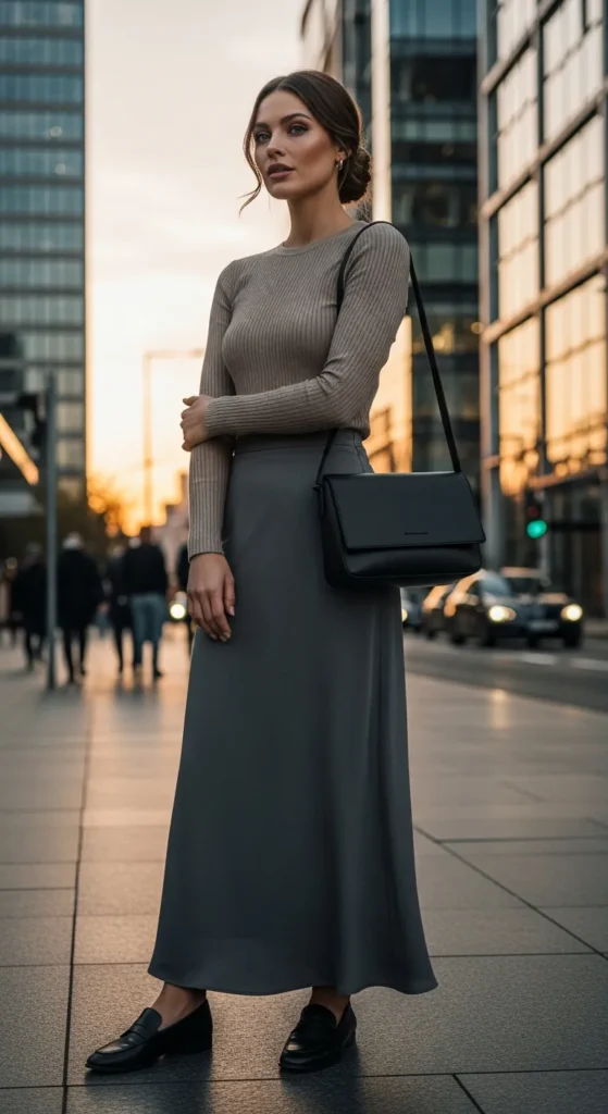 A ribbed long-sleeve top paired with a straight long skirt feels sleek and confident. It’s an understated look that works beautifully for everyday routines.