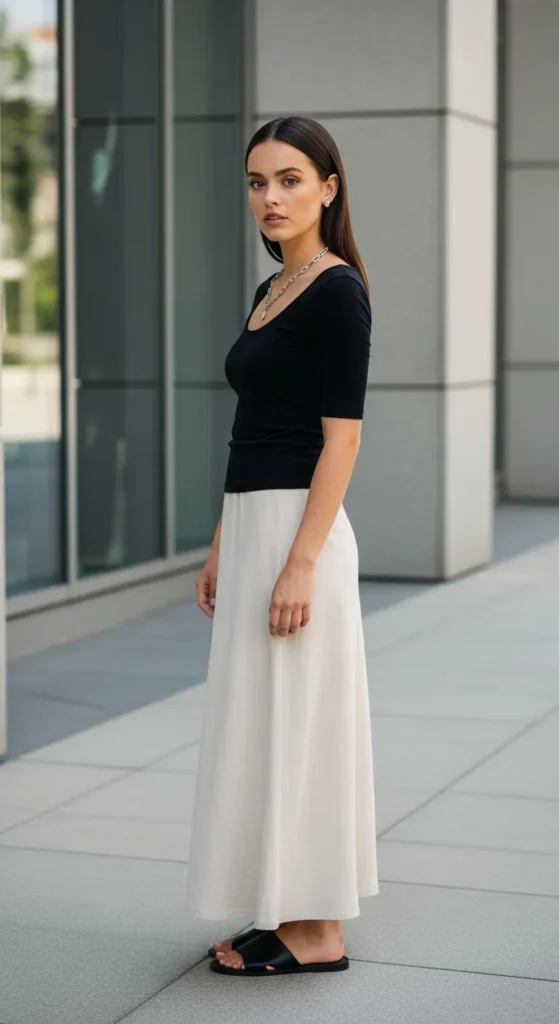 A black top paired with a light neutral long skirt creates contrast without drama. It’s clean, chic, and endlessly wearable.