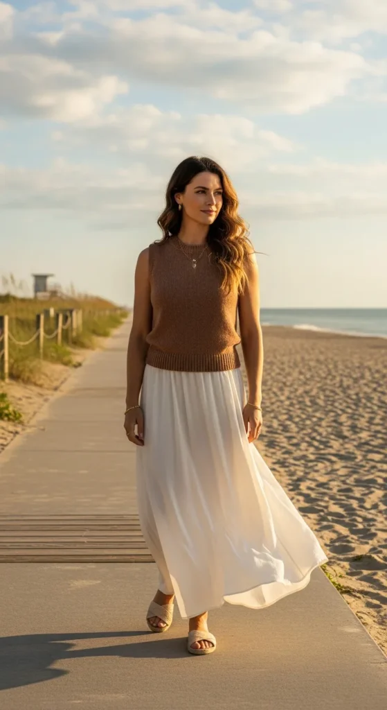 A sleeveless knit top paired with a flowing maxi skirt creates a calm, confident outfit that feels balanced and modern. It’s effortless without looking unfinished.