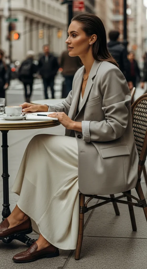A soft blazer layered over a lightweight long skirt creates an effortless polished vibe. It’s perfect for casual meetings or coffee dates.