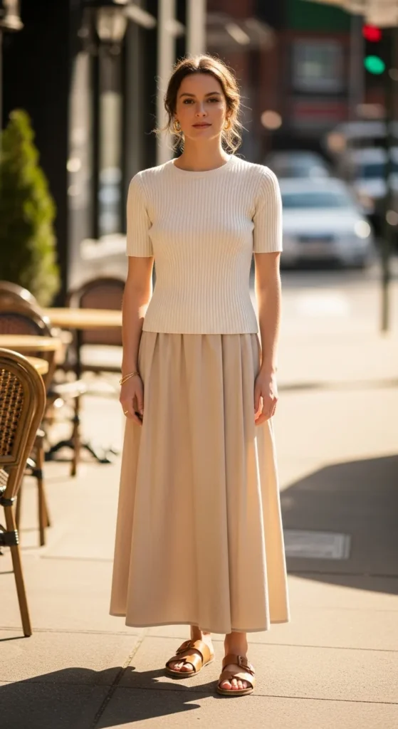 A fitted soft-knit top paired with a breezy cotton long skirt feels relaxed yet thoughtfully styled. It’s the kind of outfit that works for errands, brunch, or slow afternoons while still looking quietly polished.