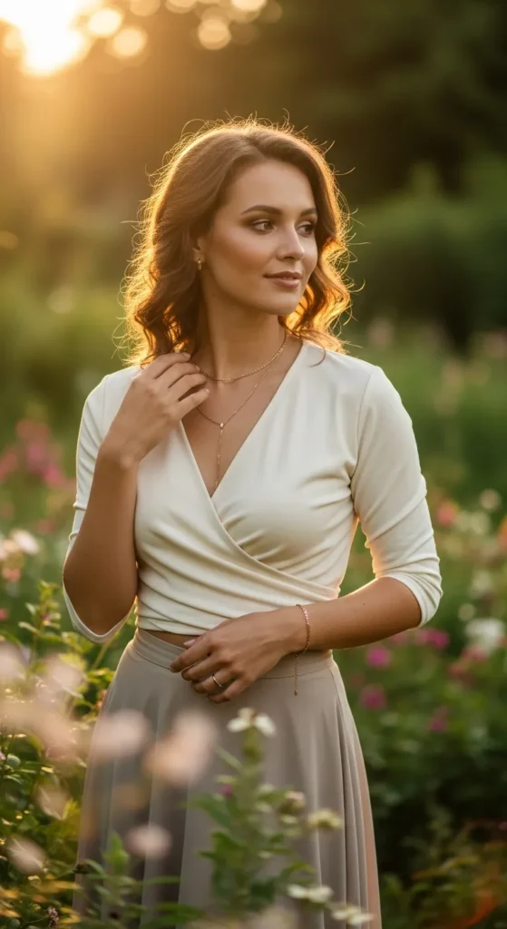 A soft wrap top paired with a flowing long skirt creates gentle shape and movement. It feels feminine without being overdone.