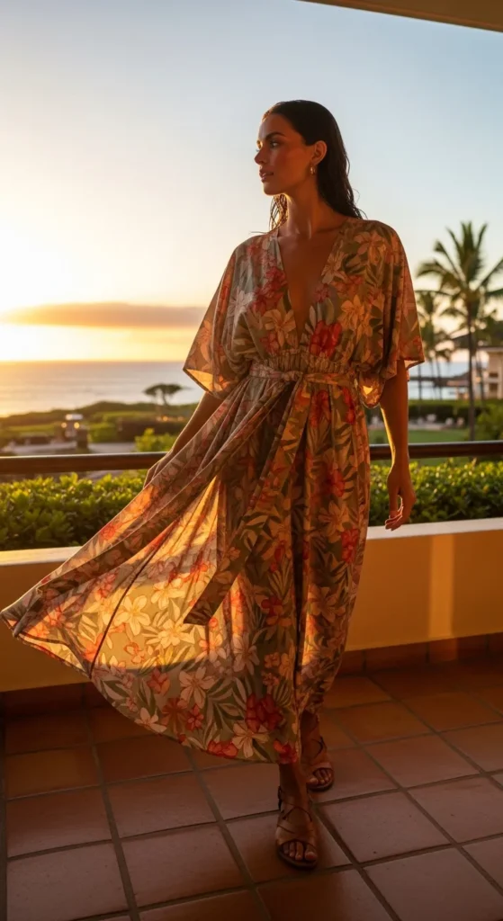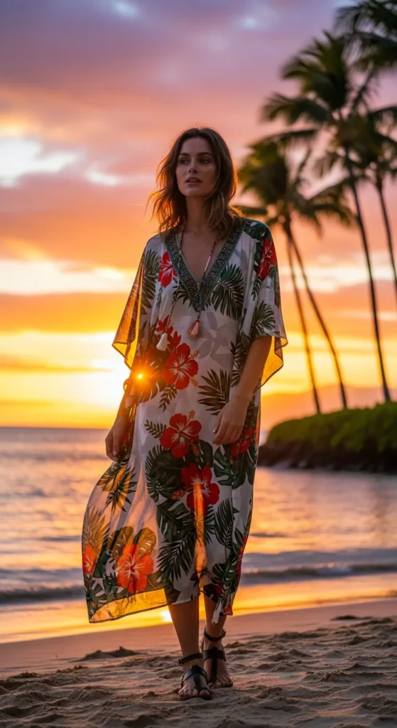 A kaftan-style dress is effortlessly elegant and forgiving. Its loose silhouette keeps you cool while soft tropical prints make it feel intentional and festive.