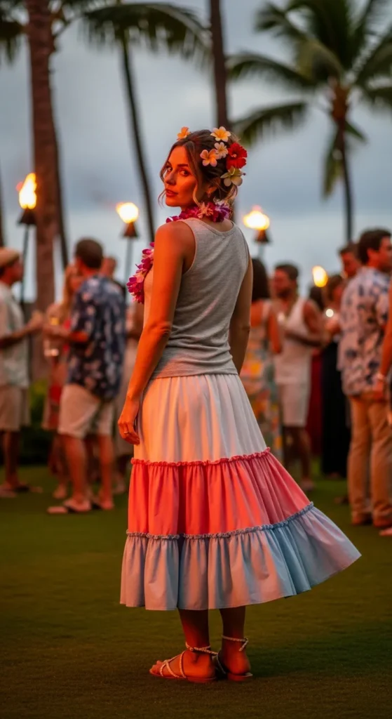 A sarong styled as a skirt feels authentic and playful. Paired with a neutral top, it becomes approachable and perfect for casual island celebrations.
