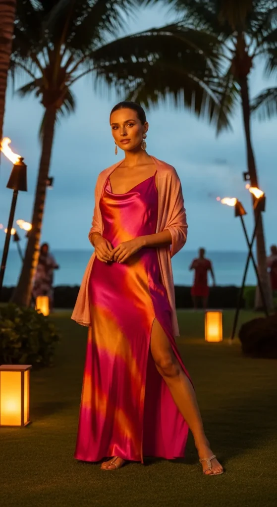 A tropical-print slip dress feels effortless and chic. The side slit adds movement without being dramatic, making it ideal for evening lūʻau celebrations with music and dancing.