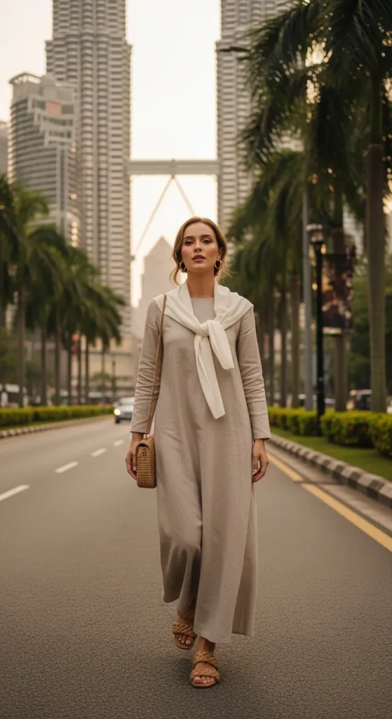 Malaysia is that dreamy mix of golden sunsets, lush rainforests, colorful street markets, and modern skylines. Whether you’re strolling through bustling cities or exploring serene islands, dressing modestly here feels graceful, respectful, and effortlessly chic. Think breathable fabrics, flowy silhouettes, and polished layering that keeps you cool without compromising style.