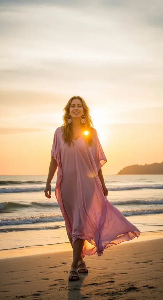 A modest kaftan dress in soft pastel tones flows beautifully for seaside dinners or sunset strolls.